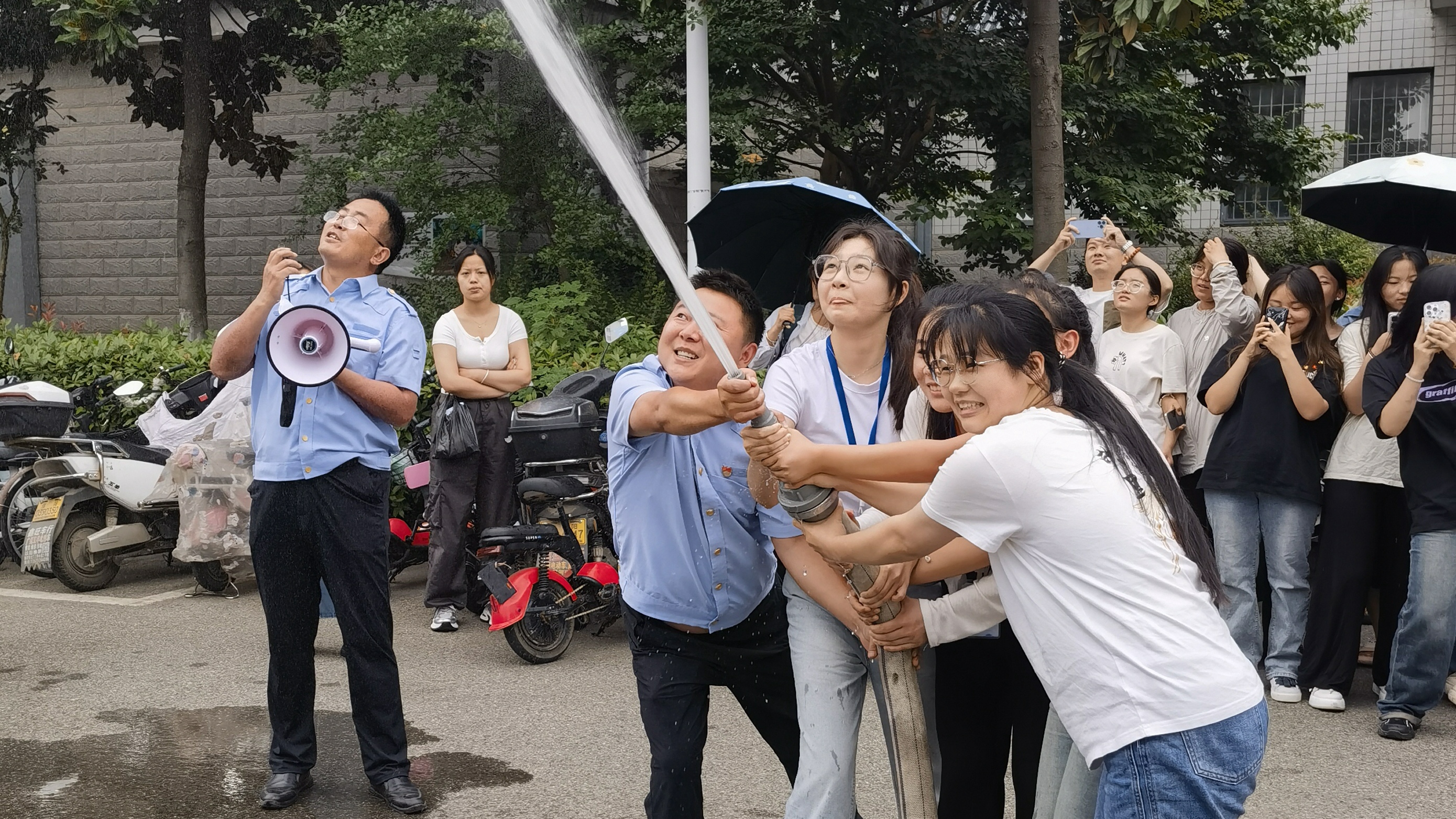 此次演练包含火灾疏散逃生和消防水带使用培训两个环节。安保处消防科科长吴长城首先介绍了演练流程,并启动应急警报。随后,宿管员迅速断电并开启疏散通道,辅导员及学生干部在关键位置引导学生有序撤离至安全区域。演练后,吴长城详细讲解了火灾自救方法和消防水带操作技巧,并进行了现场实操指导。全体人员配合默契,现场秩序井然。