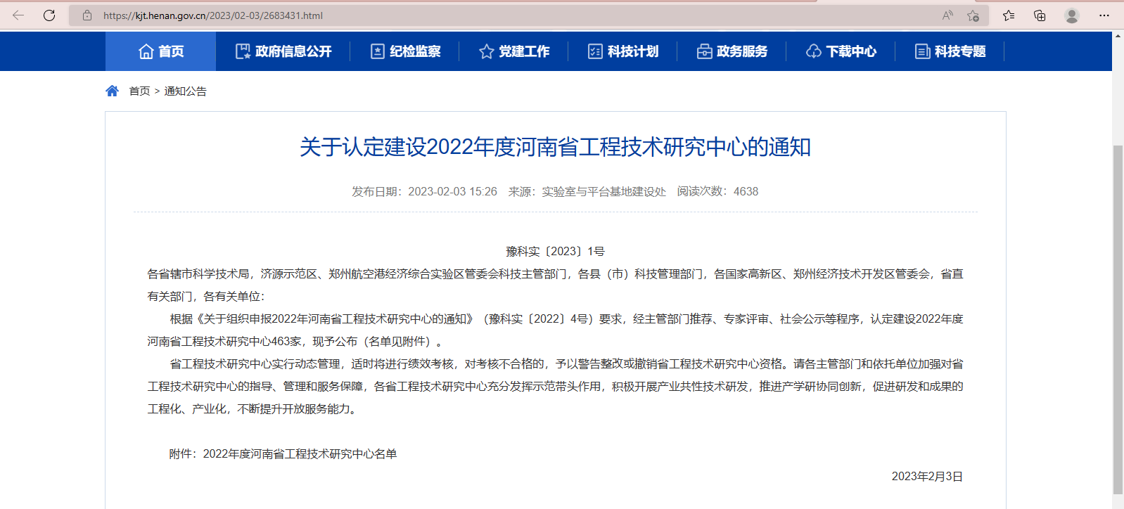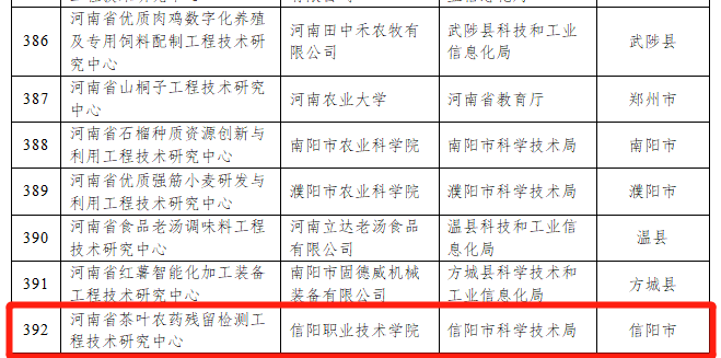 2月3日,河南省科学技术厅发布《开云官方网页版认定建设2022年度河南省工程技术研究中心的通知》,认定建设2022年度河南省工程技术研究中心463家,我校检验技术学院申报的“河南省茶叶农药残留检测工程技术研究中心”项目也在其中。