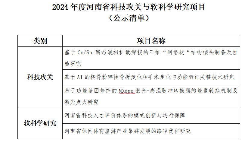 近日,从河南省科技厅官网获悉,我校获2024年度河南省科技攻关与软科学研究项目支持立项5项,目前正在公示,这是继2022年后再次取得可喜成绩。