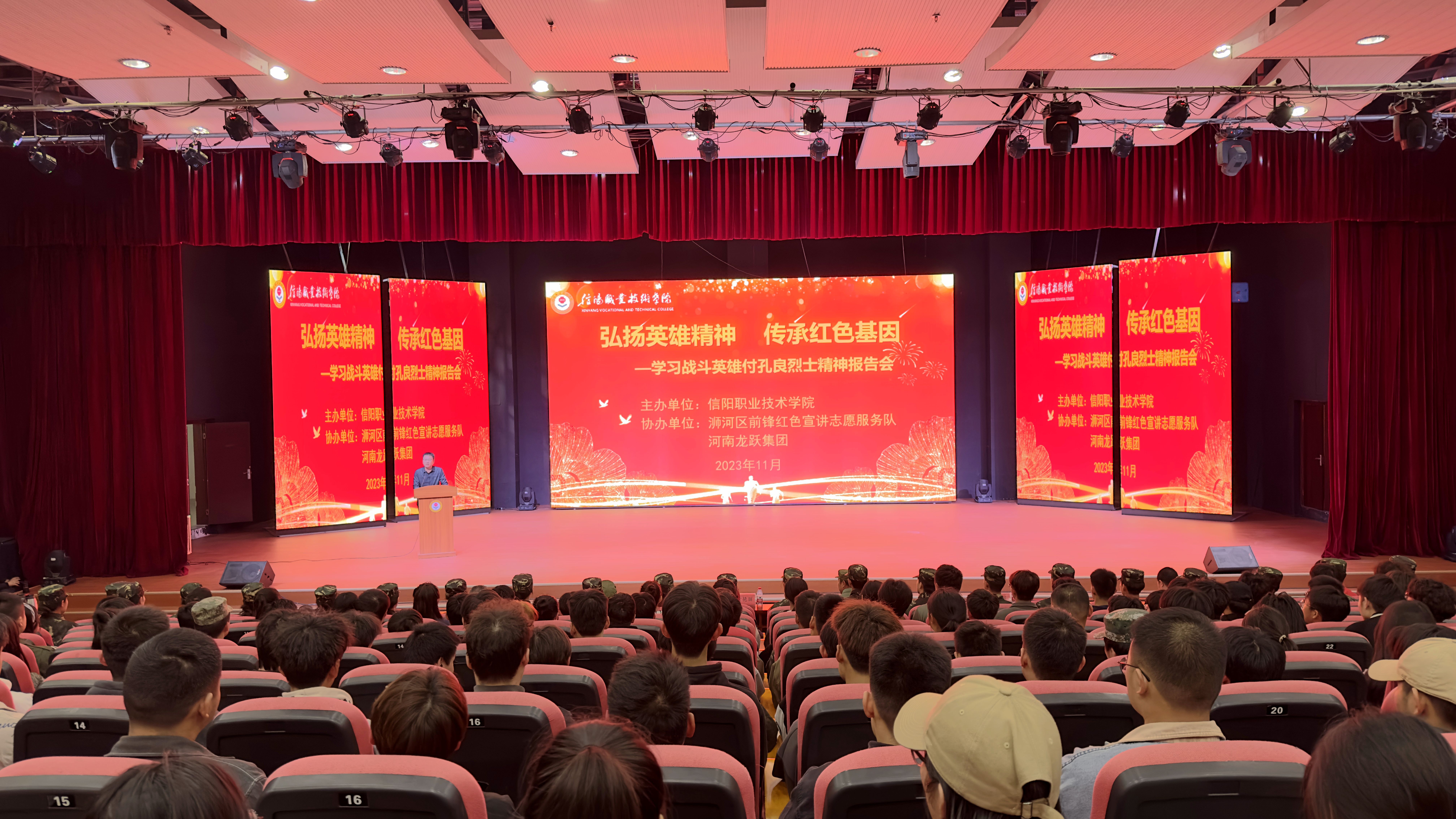 11月7日下午,学校在图书馆报告厅举行“弘扬英雄精神 传承红色基因”学习战斗英雄精神报告会。活动邀请的嘉宾有:信阳市浉河区退役军人前锋红色宣讲队队长、退役老兵张士典;对越自卫反击钢铁英雄连连长、一等功臣周金厚;对越自卫反击荣立三等功臣陈是樟和英雄烈士付孔良的妹妹、副团级转业干部付艳丽。学校学生处处长、武装部部长代翔,武装部工作人员、各学院征兵专干、国防教育协会、国旗护卫队以及学生代表共计700余人参会。会议由武装部副部长杨家升主持。