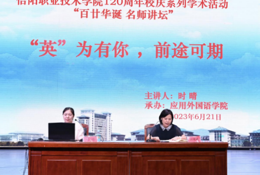 6月21日下午,应用外国语学院在图书馆报告厅举办名师讲堂报告会,此次报告会的主题是“‘英’为有你,前途可期”,主讲人为信阳市第一实验小学省级名师时晴。报告会由应用外国语学院院长刘晓鹂主持,学院即将走上实习岗位的2021级学生、部分教师参加了此次报告会。